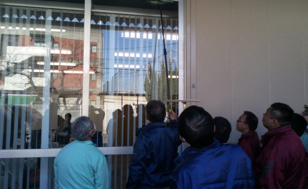 今回はスクイジーとウオッシャーを使用した清掃です。